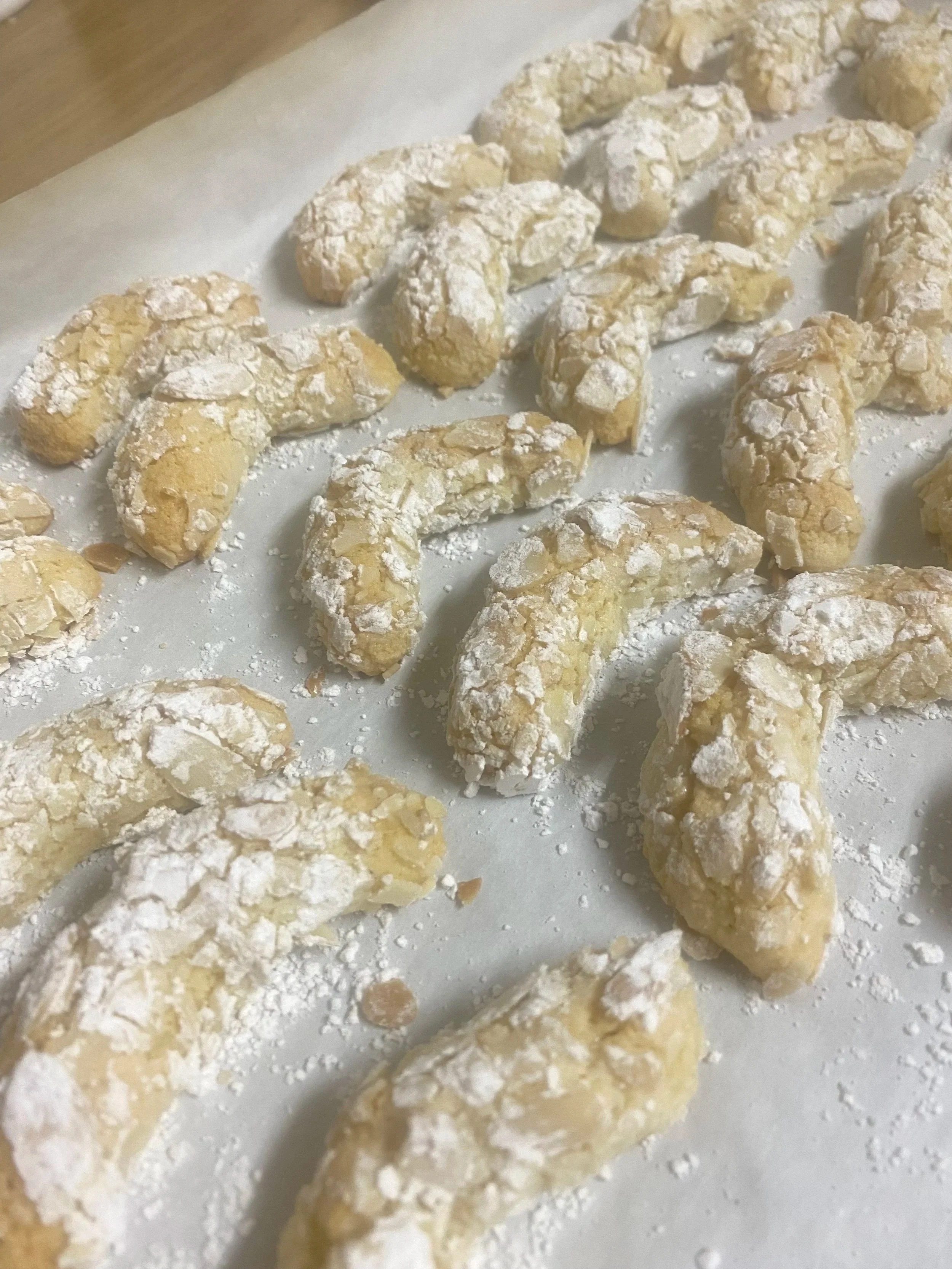This past Saturday my sister and I spent the afternoon learning how to bake “Biscotti Greca” with our Nonna, best characterized as a crescent-shaped almond cookie. She swears they are Greek cookies, but there are Italian variations such as ricciarelli and amaretti’s. They’re soft, almondy crescents, made with almond flour, slivered almonds, eggs, sugar, and plenty of love — golden on the outside and tender in the middle. Maybe they’re Greek. Maybe they’re Italian. Maybe they’re just Nonna cookies. All I know is, they’re chewy, delicious, and always a hit! Bake before hosting, special occasions, or to bring when visiting family and friends - everyone will love them!